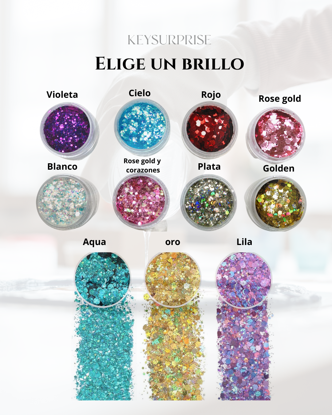 Para personalizarlo: Elige un color, tipo de letras, iconos y brillos si lo deseas agregar a tu pieza.