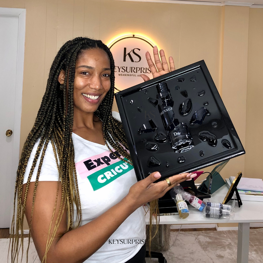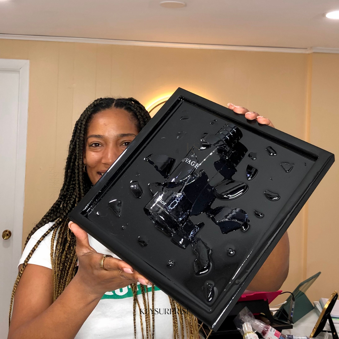 Botella rota como la pieza central, encapsulada en una estructura de resina cristal. Adornada con brillos y destellos negros.