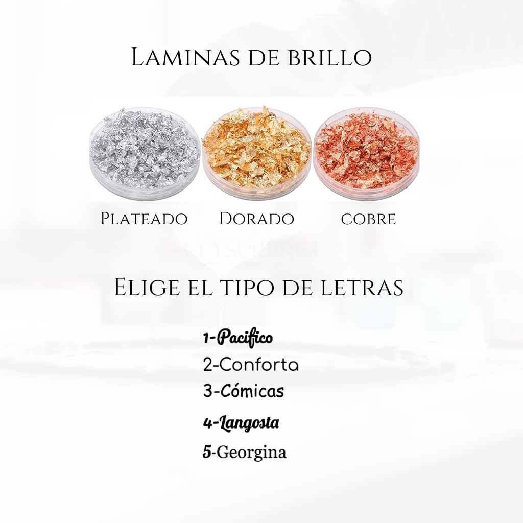 Para personalizarlo: Elige un color, tipo de letras, brillos o flores si lo deseas agregar a tu pieza.